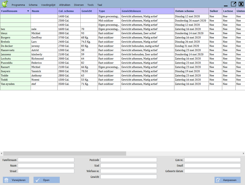 U kan in deze database ook de klantgegevens nog aanpassen zonder het voedingsschema opnieuw in te laden.